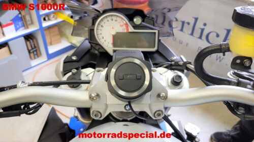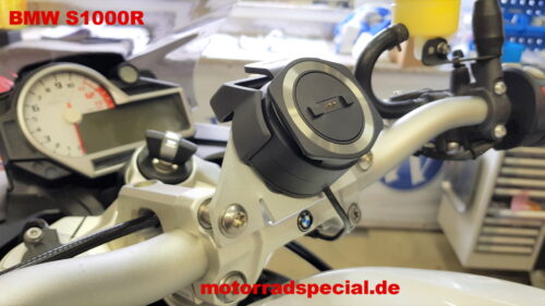 Wir haben einen Navigationshalter für die BMW S1000R mit MV Lenkererhöhung entwickelt. Damit die Sicht auf das Navidisplay klar bleit, haben wir Vibrationsdämpfer verbaut. Dadurch, dass die Bauart sehr flach ist und die Montage auf der Klemmung des Lenkers durchegeführt wird, bleibt die Sicht auf die Armatur frei und dadurch fällt er kaum auf.